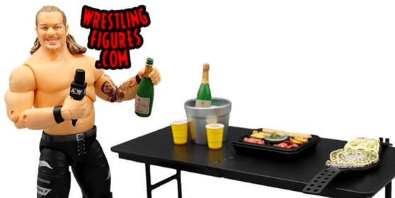 In commemoration of Jericho becoming Le Champion, the set comes packaged to resemble a champagne bottle. Featured accessories include the AEW World Championship title belt, two bottles of bubbly, a champagne bucket, deli platter, solo cups, a folding table and a Jericho action figure T-shirt.
