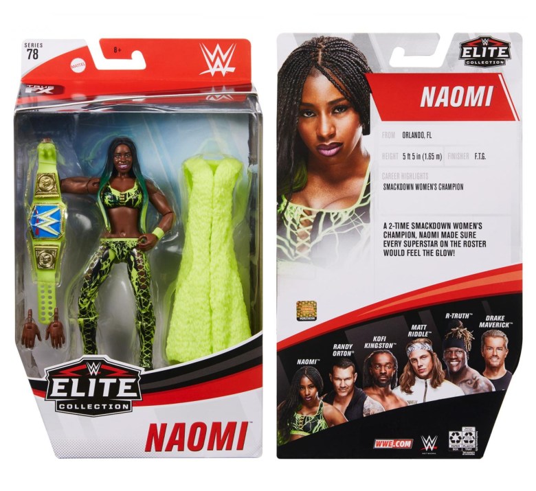 The chase figure in the set is Naomi in her “Feel the Glow” attire and a glow-in-the-dark WWE Women’s SmackDown Championship. The core offering Naomi doesn’t have the same colorful attire — just more green. This feels like a tossup to me with neither figure standing out over the other, and so I won’t be store hopping or paying inflated prices on eBay for this one. Verdict: Buy it for retail if I see it.