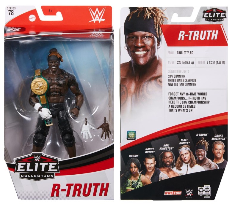 Has R-Truth had an Elite since Elite 15? It feels like it’s been a decade since R-Truth was featured in the Elite line. But this R-Truth figure isn’t one to sleep on. The debut 24-7 Championship makes it a must-have, and the likeness on Truth is spot on. The 24-7 Championship isn’t glossy, but really, it works. Verdict: Buy it for retail.