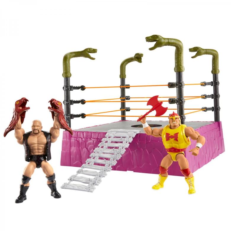 Also exclusive to Walmart is the “Rattlesnake Mountain Ring” playset, featuring the first WWE Masters figures of Hulk Hogan and “Stone Cold” Steve Austin.