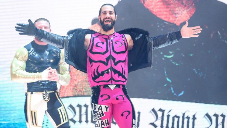 Rollins is likely also from the 2020 event in his Monday Night Messiah mocking Rey Mysterio purple body suit. Carmella is likely in her 2018 pink “fabulous” gear.