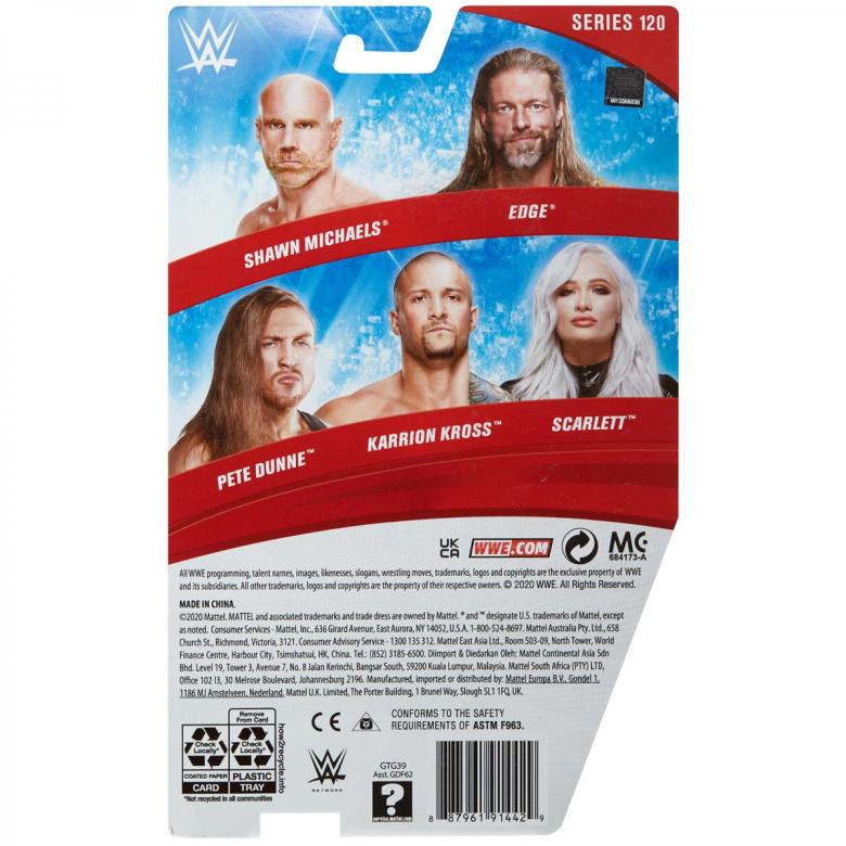 Mattel revealed the first images of Basic Series 120 on WWE.com this morning. The lineup features the debut figure of Scarlett, as well as the first basic of Karrion Kross, the first bald Shawn Michaels figure, a new Edge and Pete Dunne.