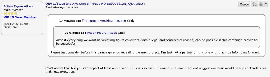 Making this project come to fruition doesn’t just unlock everything we will receive in this campaign. It opens up future projects, whether that’s the SmackDown fist stage, Hell in a Cell, WCW Monday Nitro set, or whatever. Mattel WWE marketing manager Steve Ozer has said “almost everything we want as wrestling figure collectors (within legal and contractual reason) can be possible if this campaign proves to be successful.”