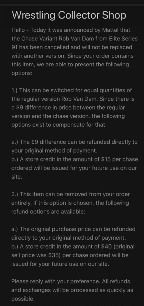 The previously announced Rob Van Dam WWE Elite 91 chase figure has now been pulled. Although Mattel has yet to officially comment, the figure is no longer listed for pre-order via Ringside Collectibles. Additionally, Wrestling Collector Shop shared this message with those who pre-ordered the figure saying the figure had been canceled and would not be replaced by another version of RVD.