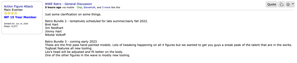 Mattel WWE marketing manager Steve Ozer also offered some insights into the next two Mattel Creations’ WWE Retros bundles. The next wave — Bret Hart, Jim Neidhart, Jimmy Hart and Nikolai Volkoff — is slated for a late summer/early fall 2022 release.