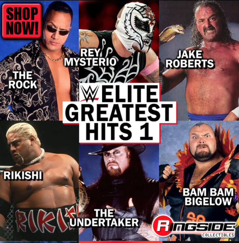 The rumored WWE Elite Greatest Hits wave is legit, and now up on both Ringside ($27.99-$29.99) and Collector Shop ($25.99 each, and junepreorder knocks off 20%). Both sites say a mid-September ship date for the line that includes Rikishi (Hall of Champions), Bam Bam Bigelow (Legends 5), The Undertaker (Elite 8), The Rock (Best of the Attitude Era), Jake “the Snake” Roberts (Flashback 3), and Rey Mysterio (E24).