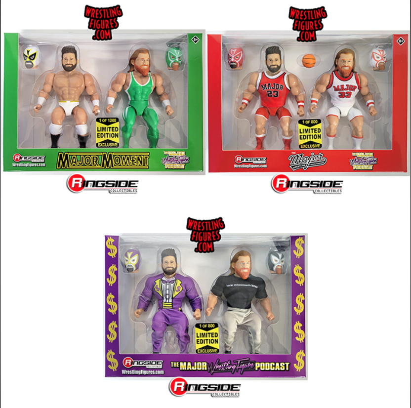 Remco-style Major Wrestling Figure Podcast 2-packs of Matt Cardona and Brian Myers are now available on Ringside. These are limited to 1-of-800 (Chicago Bulls or Thousand Dollar Broski & Bare Minimum Brian) or 1-of-1,200 (Major Moment) with a price tag of $54.99 or $49.99 each.