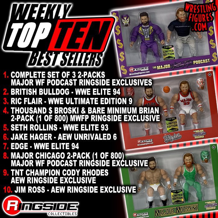 The Remco-style Major Wrestling Figure Podcast figures topped the Ringside Collectibles top 10 and took three of the top spots. Jake Hager’s AEW Unrivaled 6 figure cracks the list at No. 6, and you can snag that figure for $11.99 (or $8.99 damaged, 10% off code wfigs).