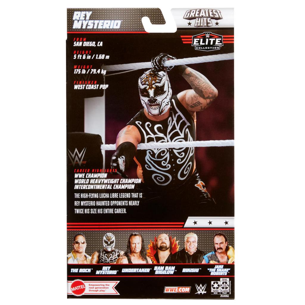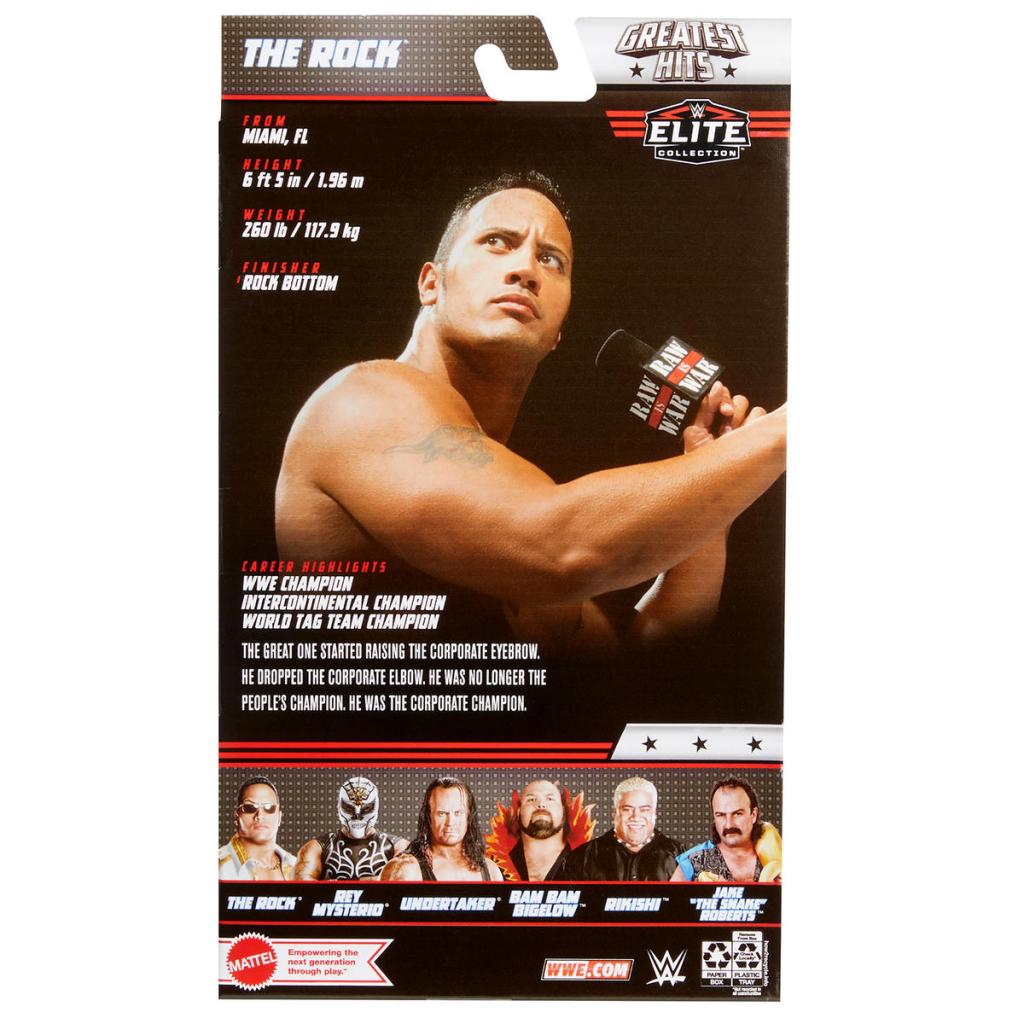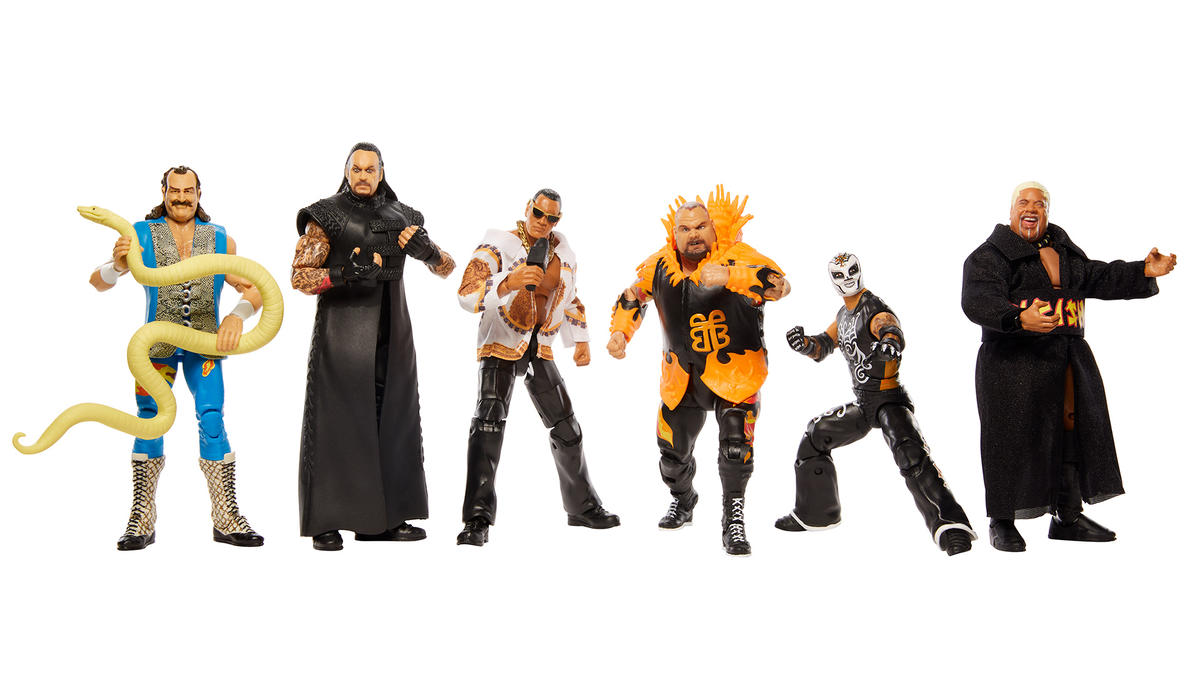 The first wave includes Jake “The Snake” Roberts (Flashback), The Undertaker (Elite 8), The Rock (Best of the Attitude Era), Bam Bam Bigelow (Legends 5), Rey Mysterio (Elite 24), and Rikishi (Hall of Champions)
