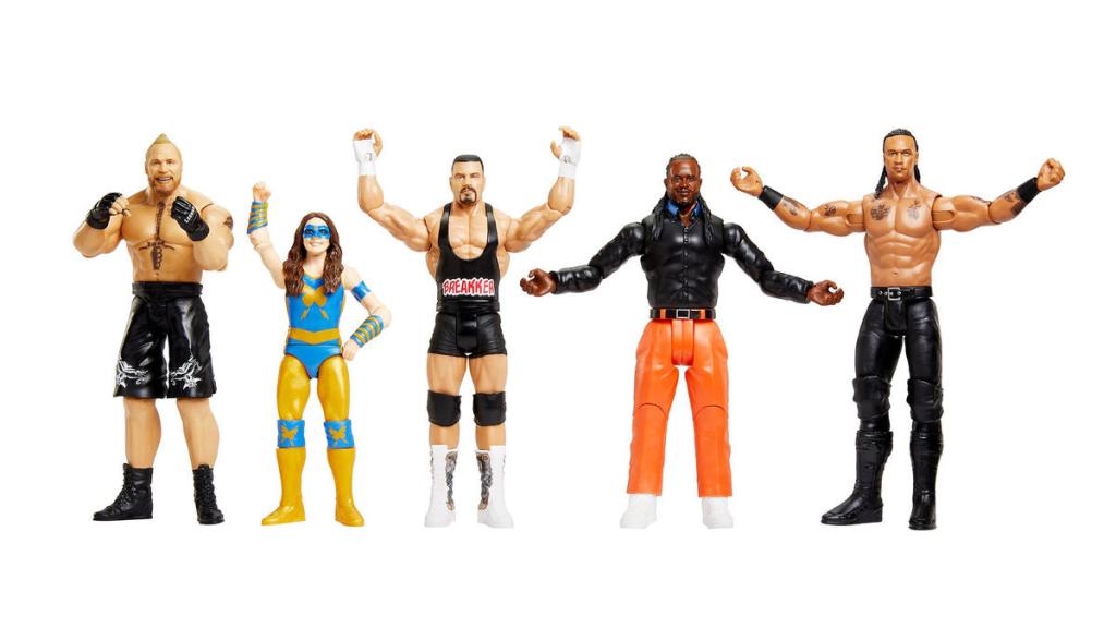 WWE 135 features Breakker, Reggie, Brock Lesnar, Nikki ASH, and Damian Priest. The set is slated to ship from Ringside in October ($99.99). Individual figures of Breakker, Reggie and Nikki are on back order until November.