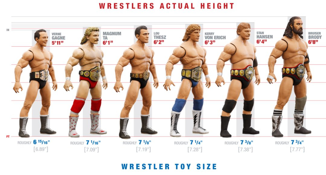 PowerTown offered a scale comparison of its first six figures (see above) so you can get an idea of just how tall they’l be in comparison to Mattel WWE and Jazwares AEW figures.