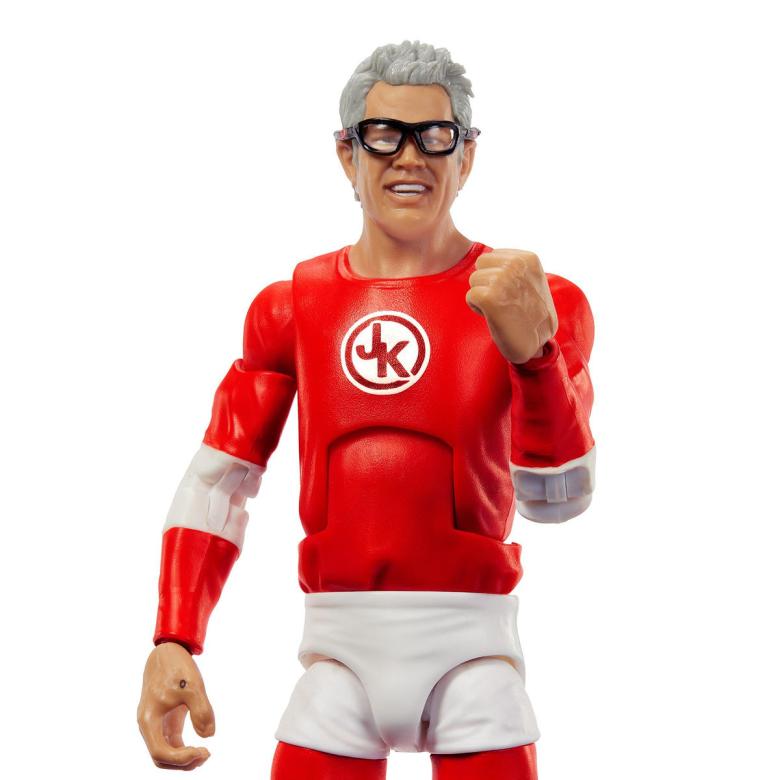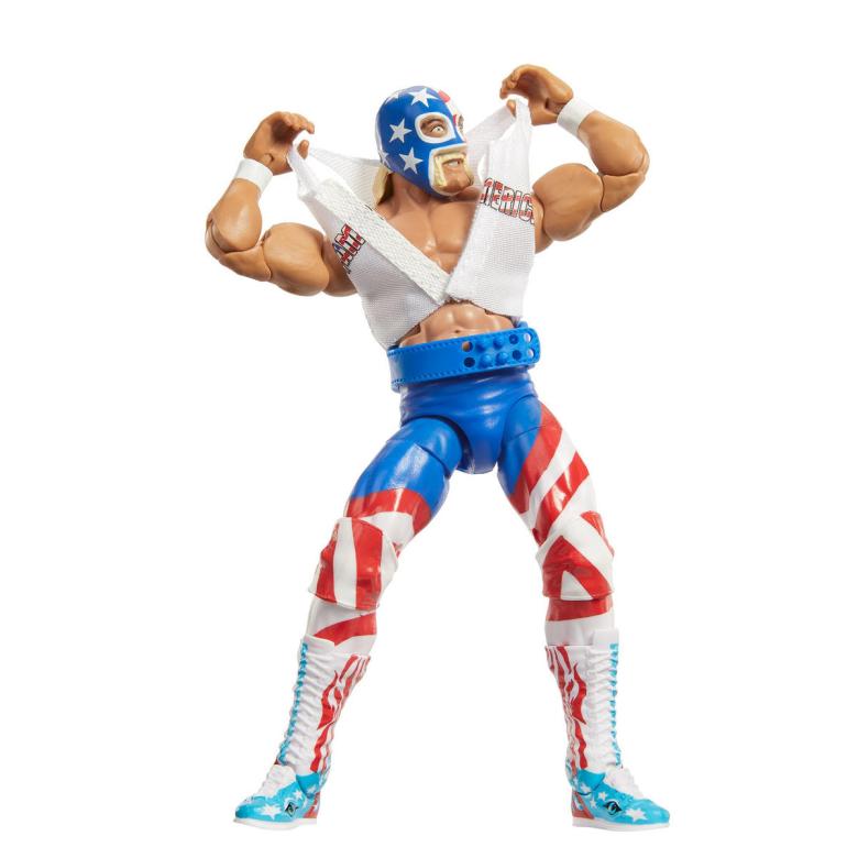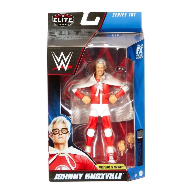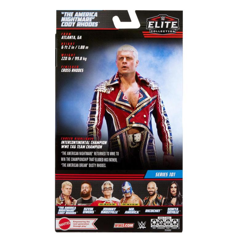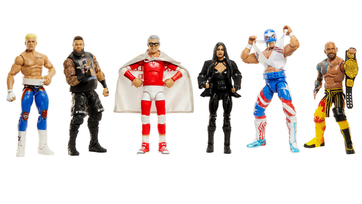 The six figures in the set include Rhodes, Mr. America (who looks a lot like Hulk Hogan), Kevin Owens, Johnny Knoxville, Sonya Deville, and Ricochet. Here’s a look at the set.