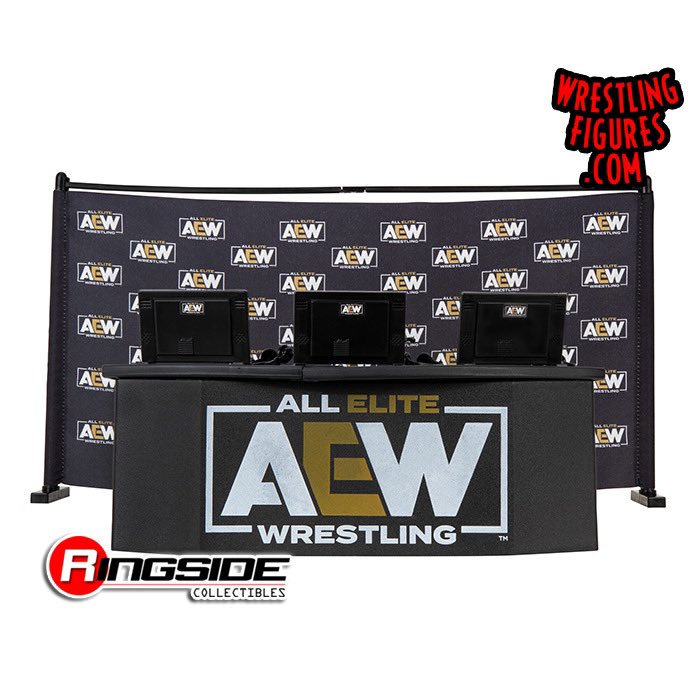 The playset comes with a breakaway announcer’s desk, three monitor displays, three headsets and a fabric backdrop featuring the AEW logo. Ringside is offering the set for $24.99. Follow the link to pre-order.