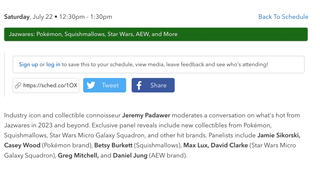 In addition to AEW, Jazwares’ hourlong panel moderated by Jeremy Padawer will highlight Pokémon, Squishmallows, and Star Wars Micro Galaxy Squadron on Saturday, July 22, at 12:30 p.m. PT (3:30 p.m. ET). Greg Mitchell and Daniel Jung will rep the AEW brand.
