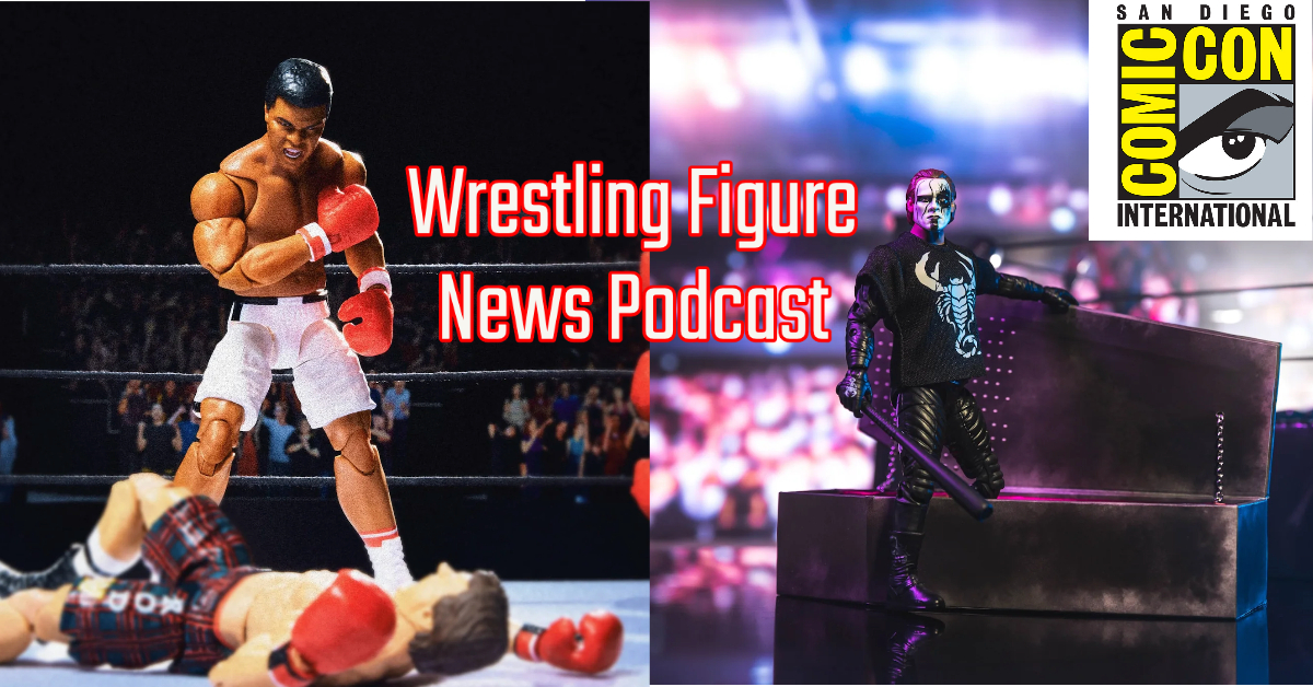 Get ready for a busy week of reveals and wallet hits. Comic Con 2023 is just days away, starting with Preview Night on Thursday, July 20. The Wrestling Figure News Podcast previews the Con exclusives from WWE (Muhammad Ali) and AEW (Sting), breaks down what we’ll probably see at the show, and shares a few wants for both figure lines.