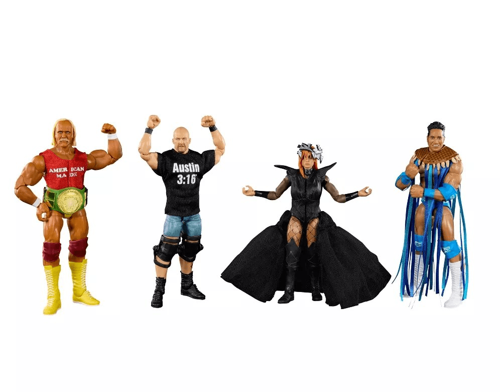 The set – Hulk Hogan, Becky Lynch, “Stone Cold” Steve Austin and Rocky Maivia – retails for $79.99.