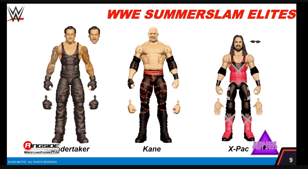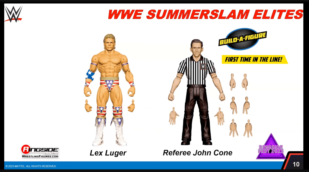 The full WWE Elite SummerSlam wave was also revealed, featuring The Undertaker from his 2015 feud with Brock Lesnar, including an alternate laughing head, Kane, X-Pac (1998) and Lex Luger from his failed 1993 WWF Championship match. The build-a-figure in the wave is referee John Cone.