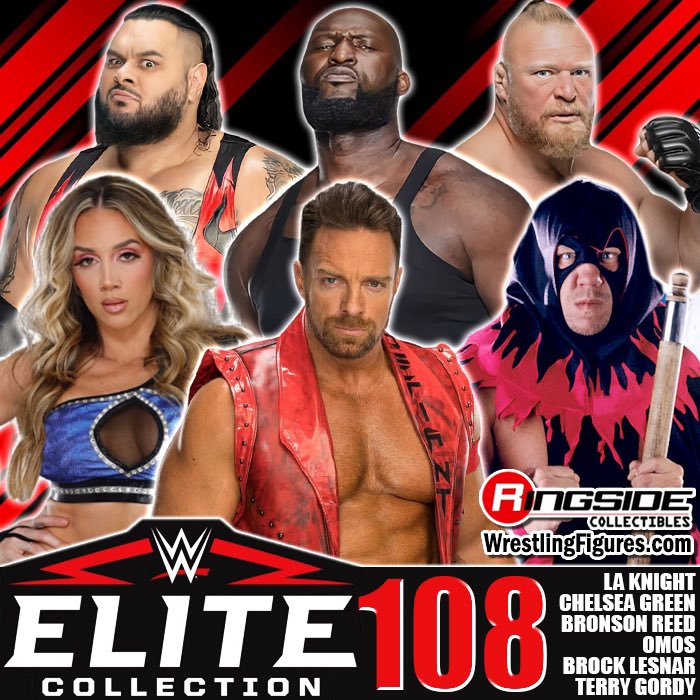 Elite 108 features the first Elite figure of LA Knight ($28.99), Terry Gordy ($27.99), and Chelsea Green ($27.99) with chase ($39.99), along with new figures of Omos ($27.99), Bronson Reed ($27.99) and Brock Lesnar ($27.99). The set is expected ship in mid-April. Ringside has it for $164.99. Follow the link to order.