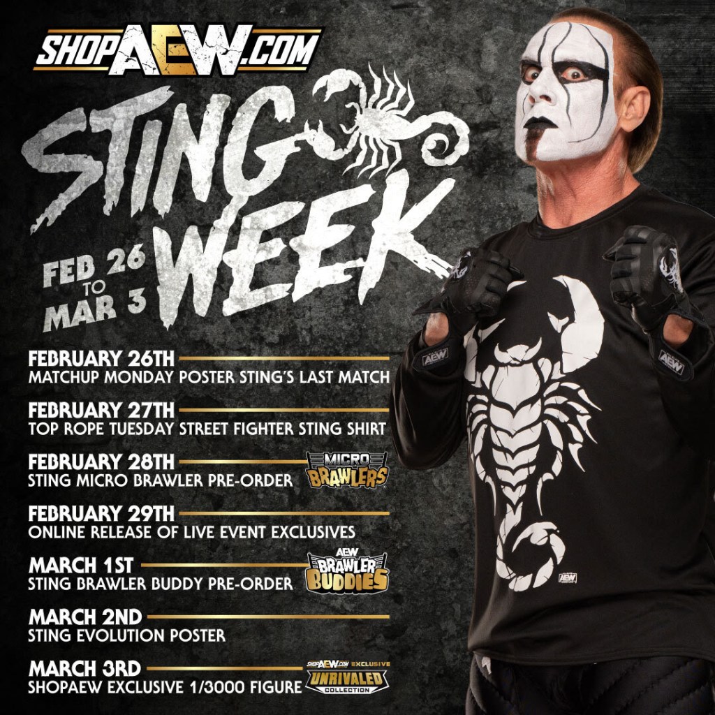 Sting week is on at ShopAEW.com. The culmination of the week will include a ShopAEW exclusive 1 of 3,000 AEW unrivaled Sting action figure.