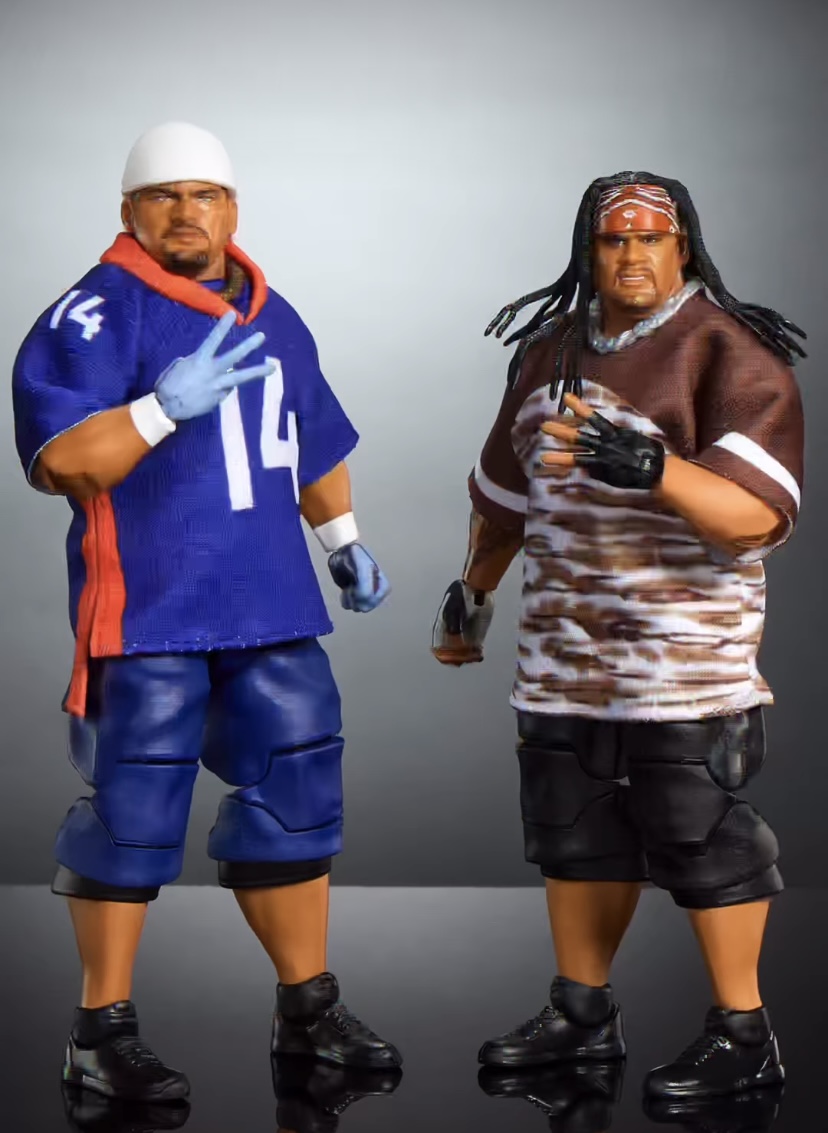 The lineup features some deep cuts, which is always appreciated, including 3-Minute Warning (Jamal and Rosey), Big Bubba Rogers (Big Boss Man) and Hulk Hogan in his Real American music video guitar playing outfit. Jamal and Rosey come with soft goods shirts. Big Bubba comes with a first-time-in-the-line UWF Championship belt and two heads, one for his early career and one for his late WCW run. Big Bubba is also the chase figure with a blue shirt variant.