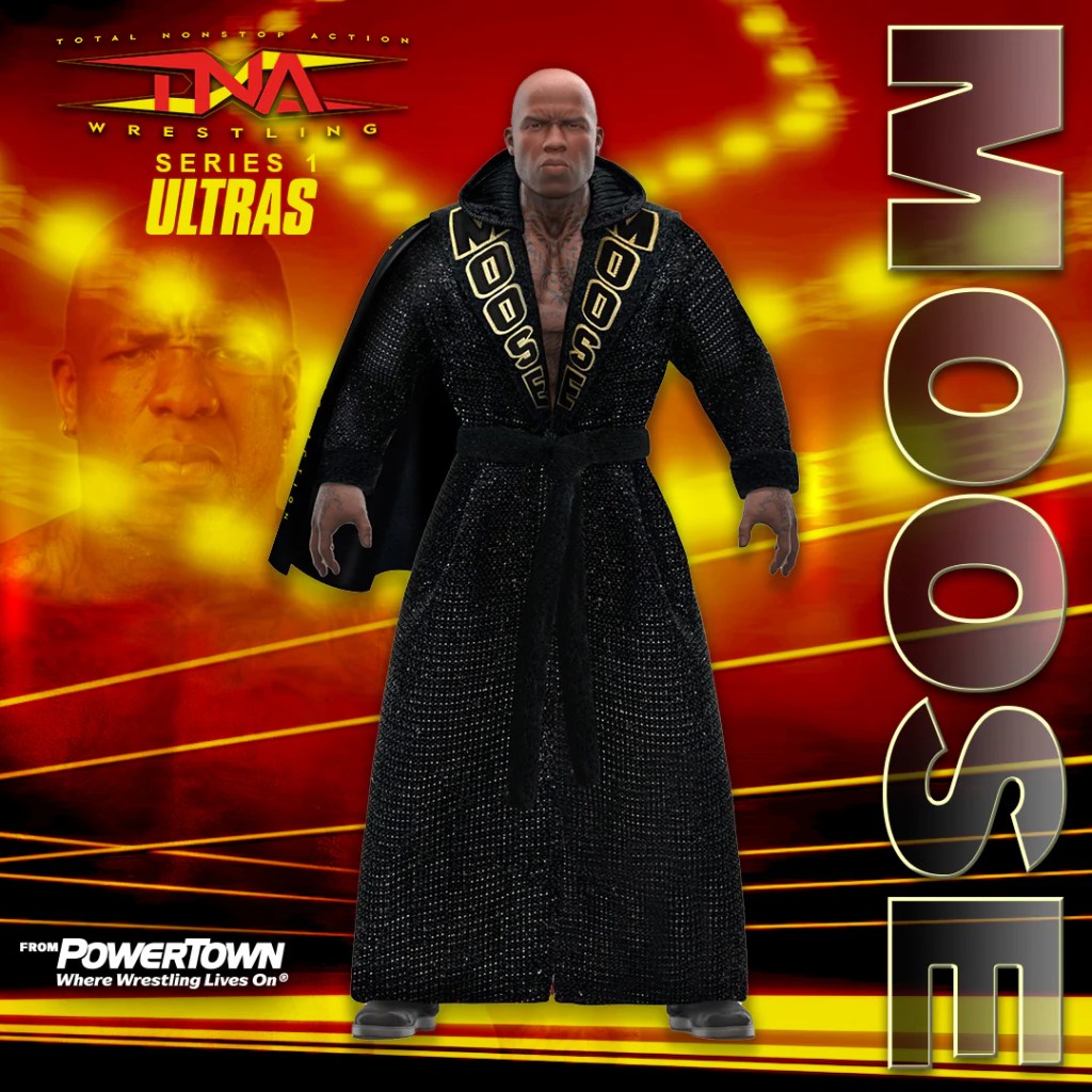 Each figure has 30 points of articulation, two interchangeable heads and extra sets of hands. Grace and Moose come with the TNA Men’s and Women’s Championships. Moose, Edwards and Alexander come with entrance gear.