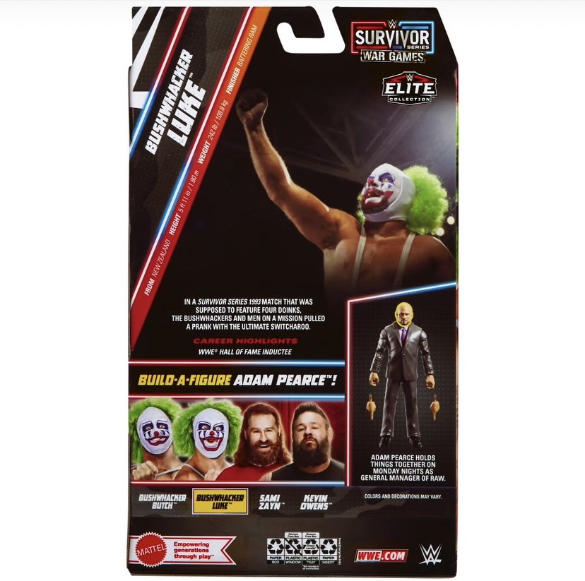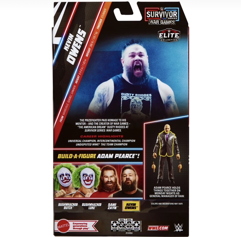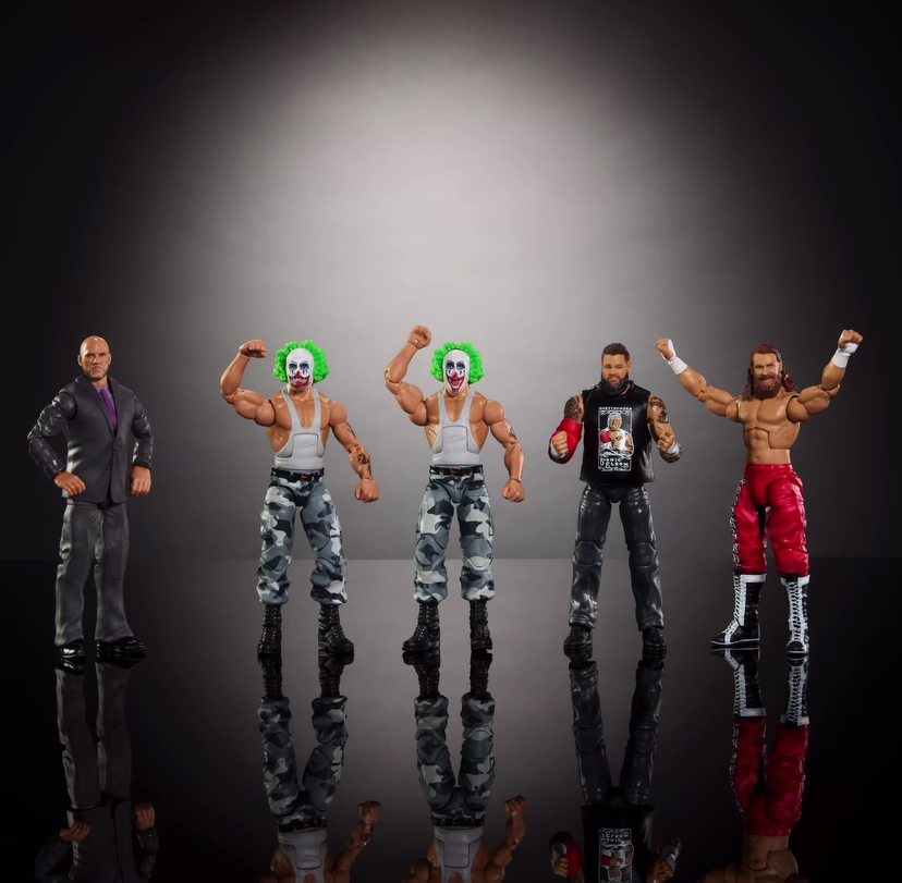 The set features Kevin Owens, Sami Zayn and Butch and Luke of the Bushwhackers (with Doink heads). Get them all and build Adam Pearce.