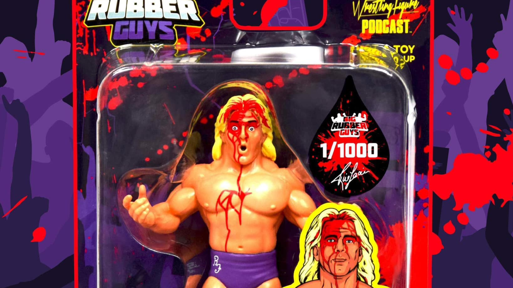 The first is a Big Rubber Guys 1 of 1,000 bloody Ric Flair figure in his iconic purple ring gear.