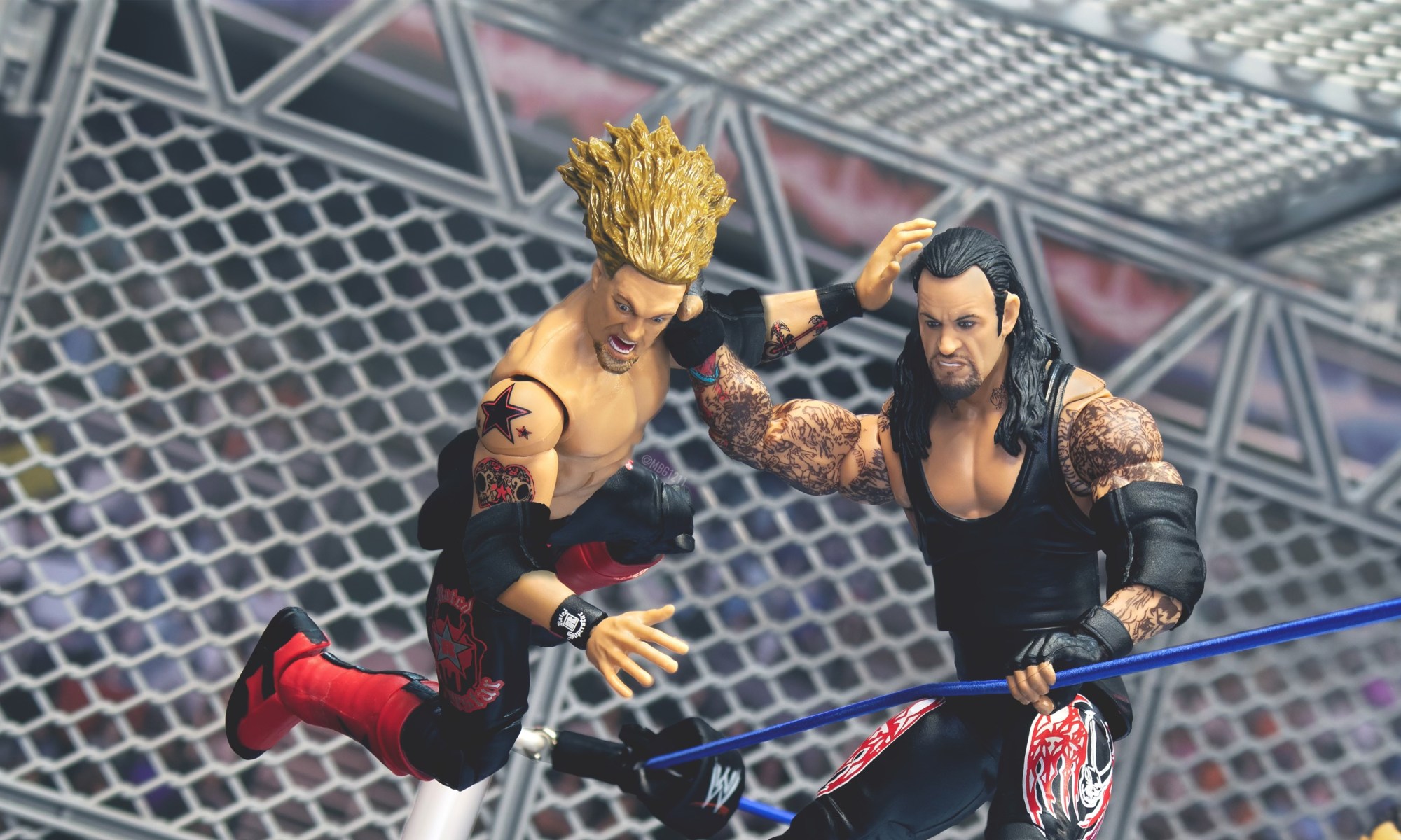 The Undertaker sends Edge through tables at SummerSlam 2008. Figure photographer Matthew Goldberg recreates this moment from their Hell in a Cell match, which Taker won.