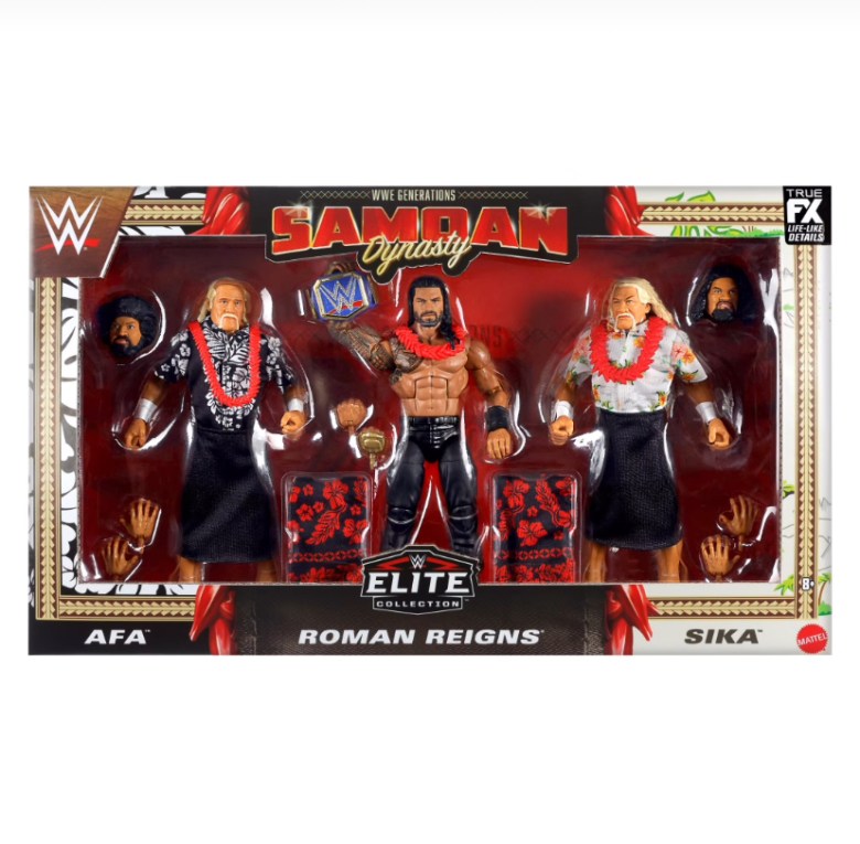 The set features Roman Reigns and the Afa and Sika of the Wild Samoans. Afa and Sika include heads from their wrestling days as well as modern heads to recreate the christening of Roman Reigns as tribal chief.