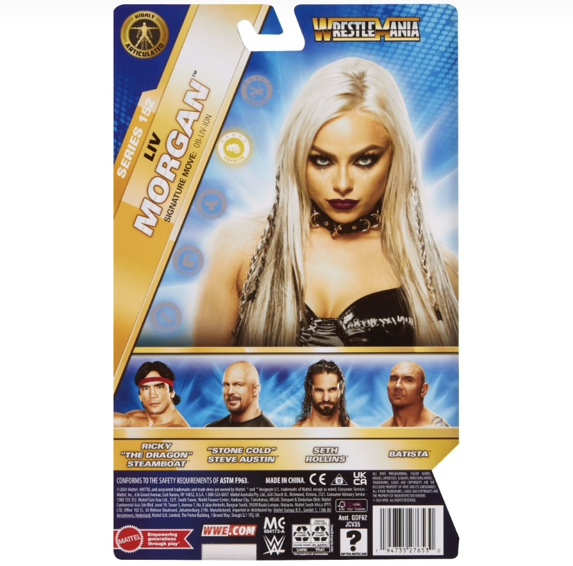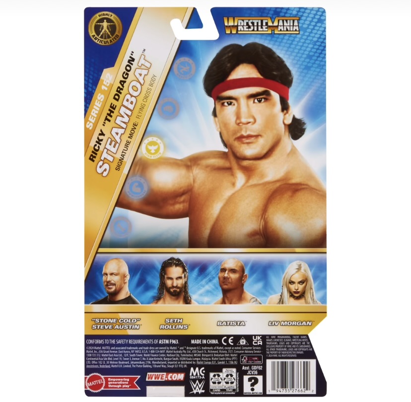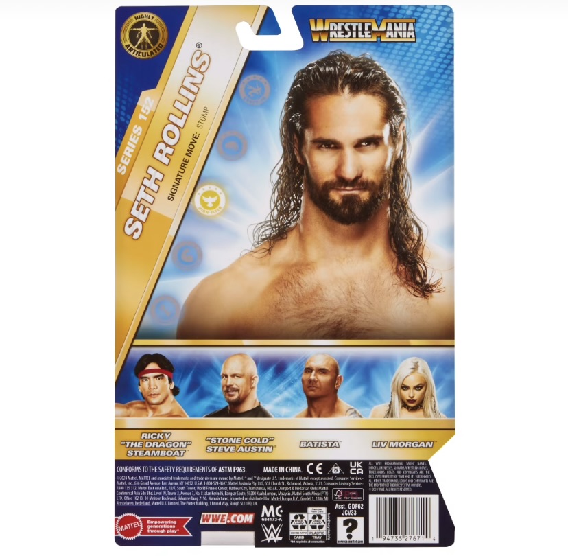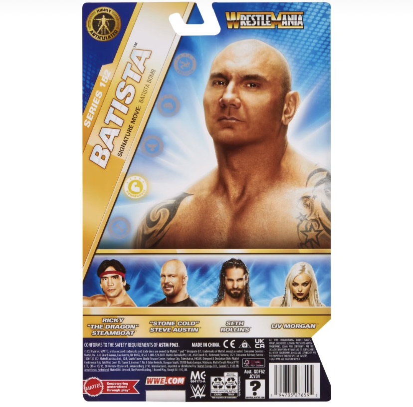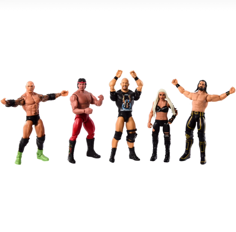 The set features: Batista, Ricky “the Dragon” Steamboat, “Stone Cold” Steve Austin, Liv Morgan and Seth Rollins.