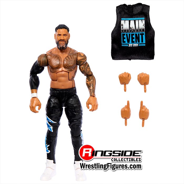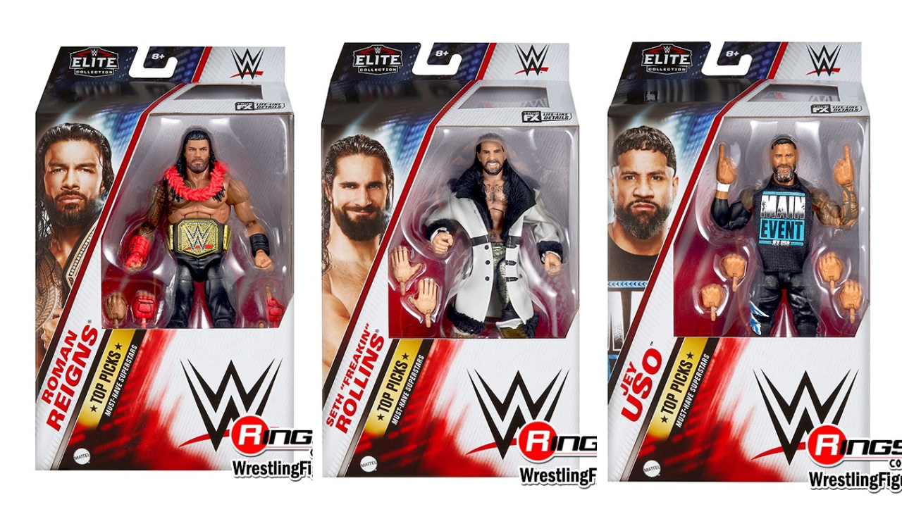 The set includes re-release figures of Roman Reigns and Seth Rollins and a first-time release of “Main Event” Jey Uso.