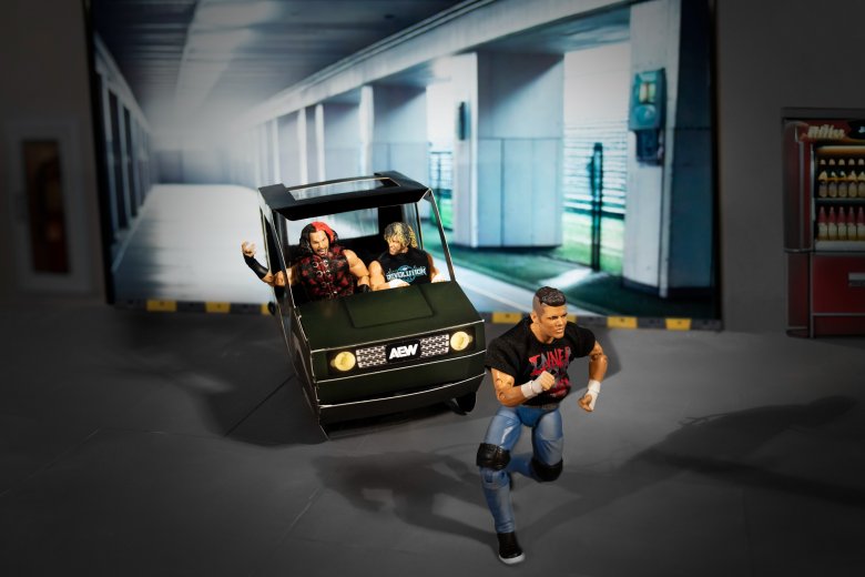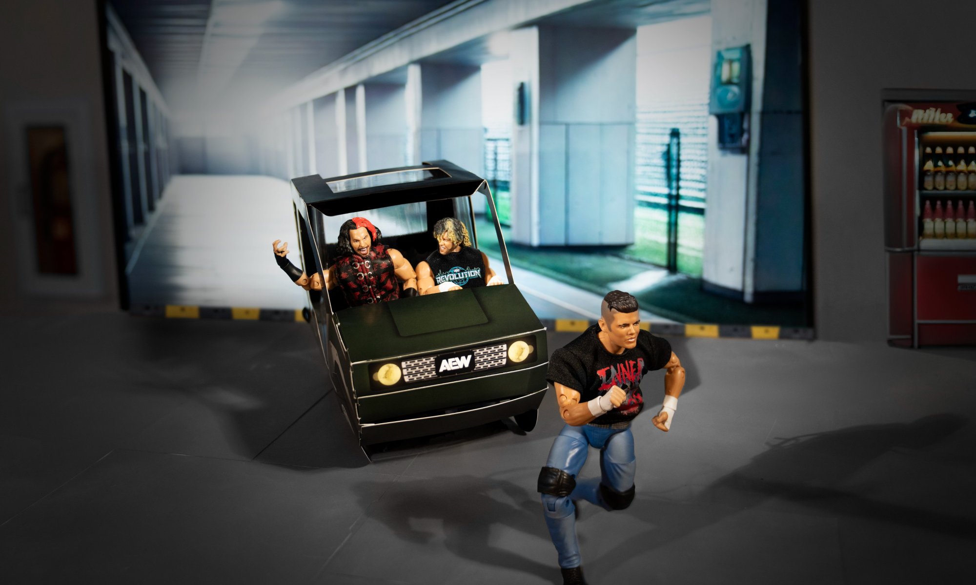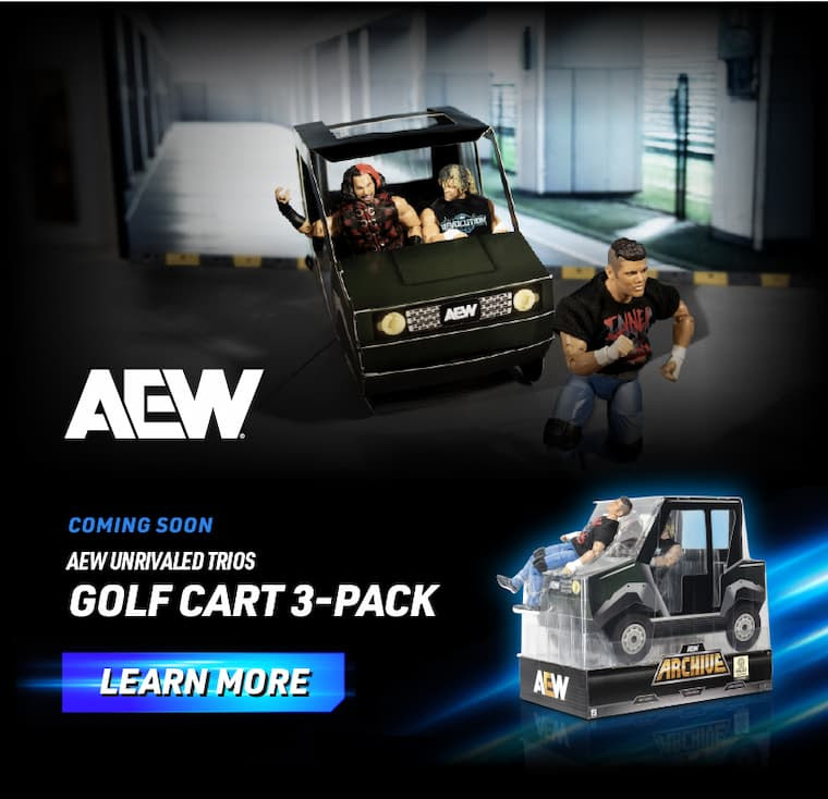Jazwares is finally immortalizing Sammy Guevara being run over by a golf cart driven by Matt Hardy and Kenny Omega. The AEW Archives 3-pack goes up for order this Friday, according to a countdown on the Jazwares Vault site.