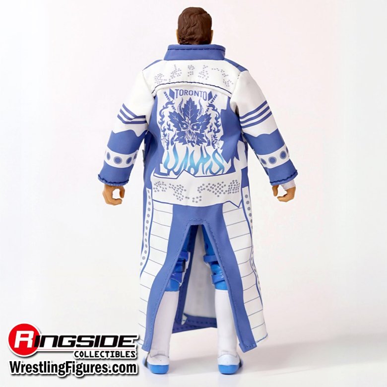 The figure represents Copeland in his Toronto gear. He comes with “Spike” and a case, the TNT Championship, a fabric entrance jacket, an extra head and extra hands.
