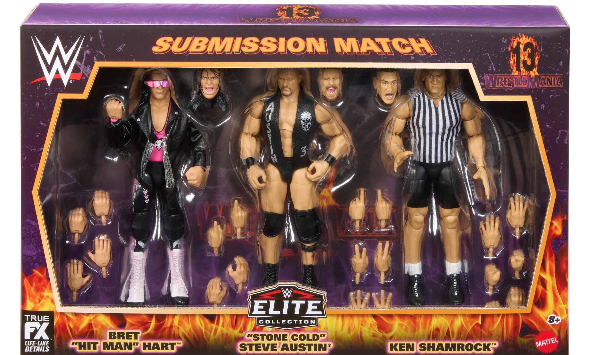 Mattel dropped studio shots of the upcoming WWE Elite WrestleMania 13 3-pack featuring Bret “Hit Man” Hart, “Stone Cold” Steve Austin and Ken Shamrock.