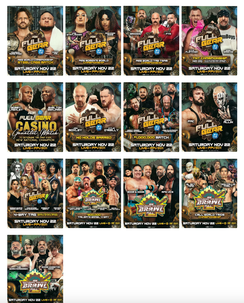 AEW Full Gear 2025 is available on Prime Video for $49.99. The main card is nine matches, plus four on the Tailgate Brawl. The show starts at 6 p.m. CT/7 p.m. ET.