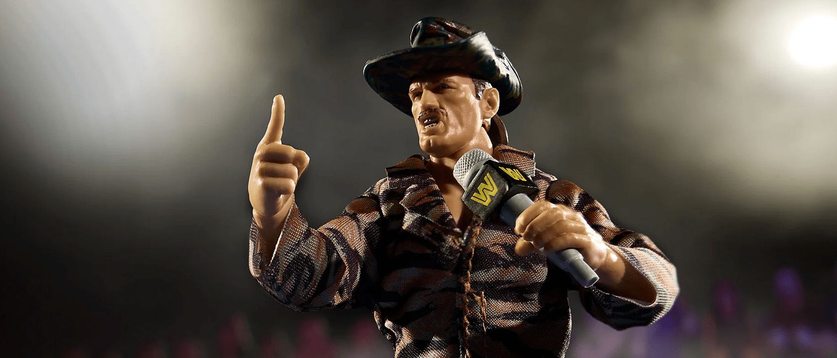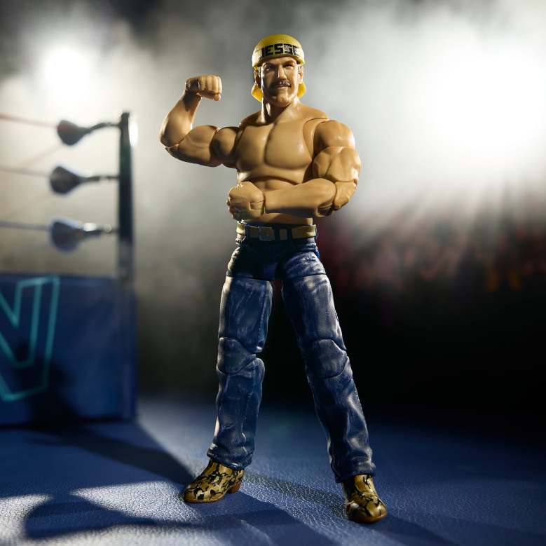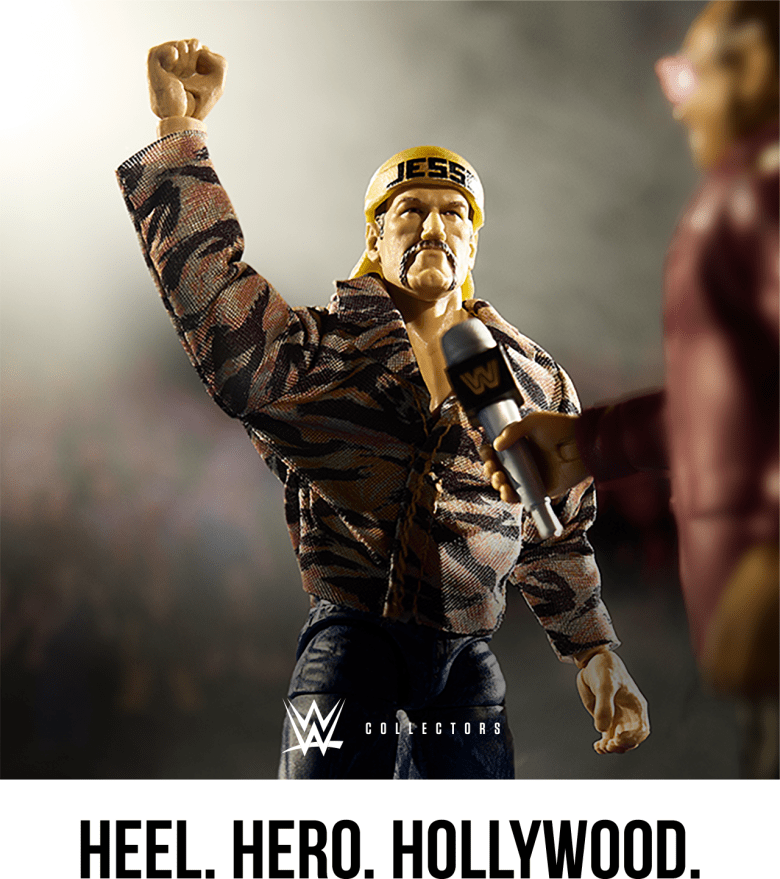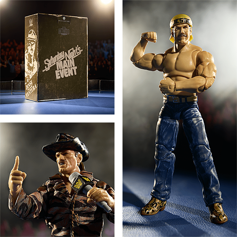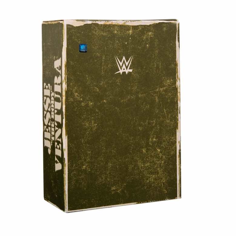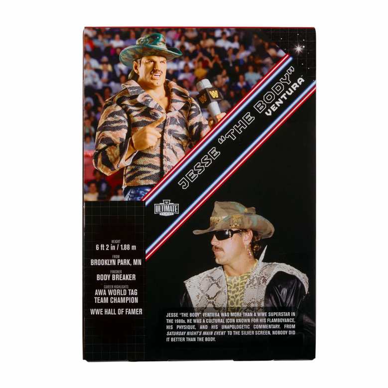 “The hottest thing in professional wrestling arrives as a WWE Ultimate Edition action figure – it’s Jesse “The Body” Ventura. He’s ready to flex as the unforgettable ringside commentator you loved at SummerSlam 1989 and on Saturday Night’s Main Event, or as the unmissable Hollywood star. Interchangeable heads make it easy to switch between his personas, and if anyone gets out of line, interchangeable hands give him the fingers to point them out, or the fists to rumble.”
